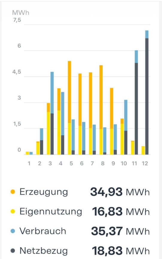 Noch waren es zwar keine 12 Monate, wie am fehlenden Stromkauf im Januar und teils Februar zu sehen, aber erste Schlüsse lassen sich ziehen, denn im nächsten Projekt wird sich mit etwas größerem Speicher in den Sommermonaten jeglichen Stromkauf vermeiden & netzdienlicher die hohen Mittags-Einspeisungen reduzieren lassen.