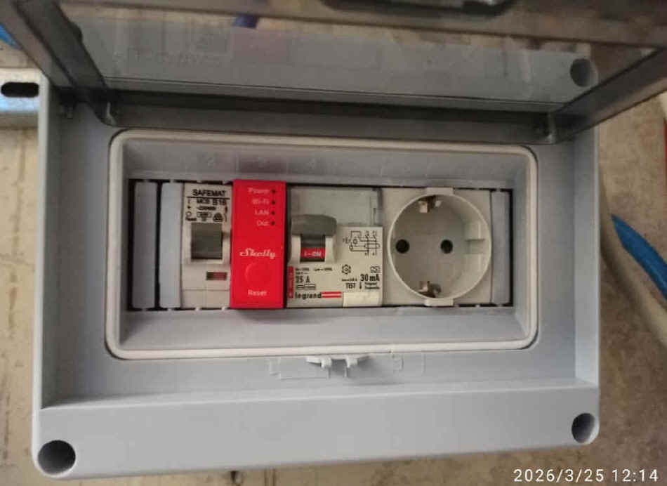 Wird nur eine Steckdose genutzt, dann nicht mehr als 3.200 W. - Möglichst mit FI-Zwischenstecker, wie auf dem Foto oben rechts knapp zu sehen.
