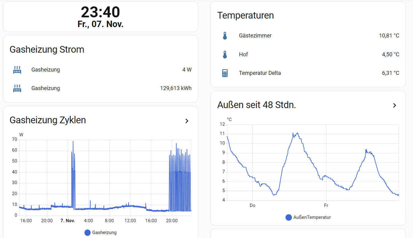 Die "Graphentäler" resultieren aus automatischer Zuschaltung von elektrischen Heizgeräten aus Überschüssen unserer PV&Akku-Inselanlage, denn bei Erreichung der gewünschten Raumtemperatur springt die thermostatgesteuerte Gasheizung seltener oder gar nicht an. Die Elektronik der eingeschalteten Gasheizung verbraucht allerdings noch immer ein paar Watt. aber immerhin kein Gas.