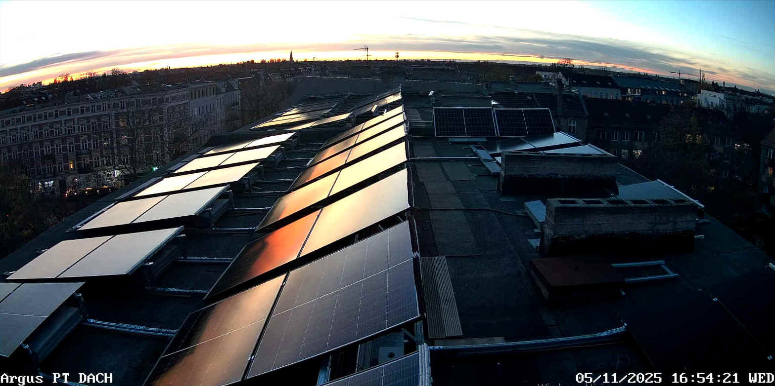 Aber wir mögen die Überwachungskamera zur Anlagen-, Horizont-, also auch Wetterbeobachtung oder im Winter, ob sich die Module selbst vom Schnee befreien oder wir nachhelfen müssen. Bisschen "Wintersport" schadet uns nicht. Das feiern wir als Vorteil der Flachdach-PV.