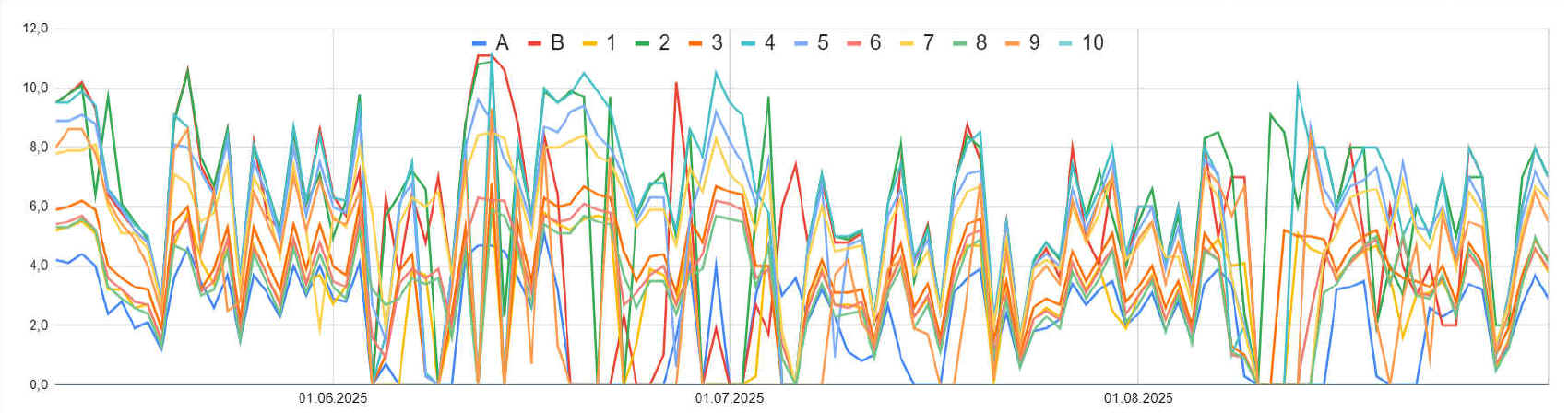 wie nachstehendes Diagramm zeigt, war es von Juni bis August sehr häufig